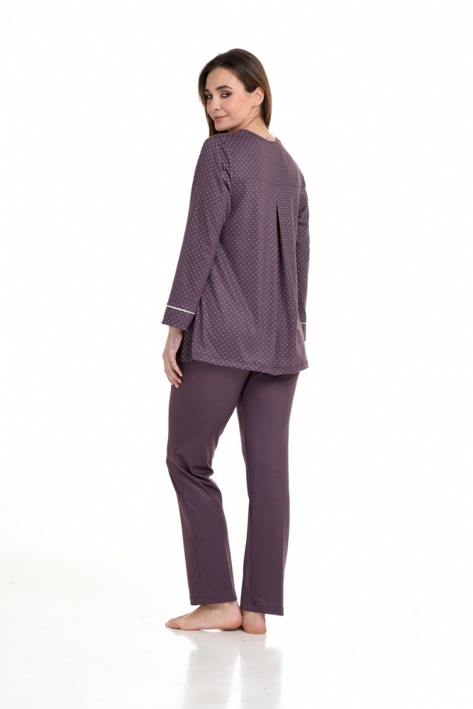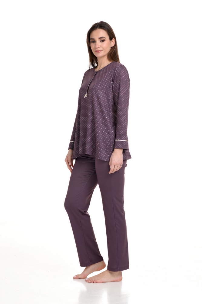 Σετ γυναικεία χειμερινή πυτζάμα, από απαλό ύφασμα Viscose / lycra .Το πάνω μέρος είναι διακοσμημένο με ένα ρομαντικό μοτίβο πουά και διαθέτει πατιλέτα στο μπροστινό μέρος με ένα μικρό φιογκάκι. Το σετ ολοκληρώνεται με ένα μονόχρωμο παντελόνι στην ίδια παστέλ απόχρωση.