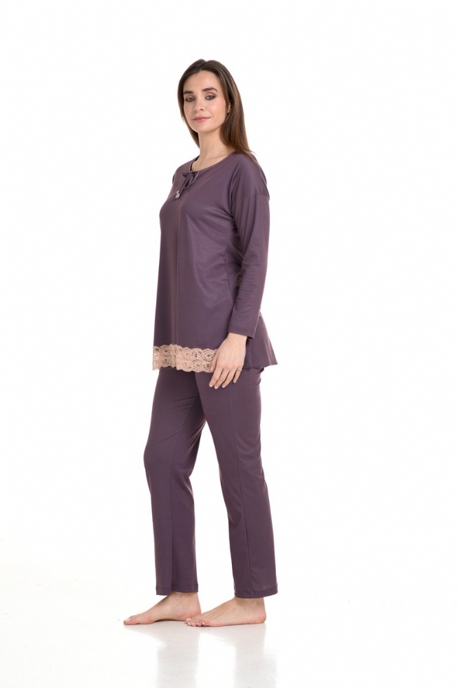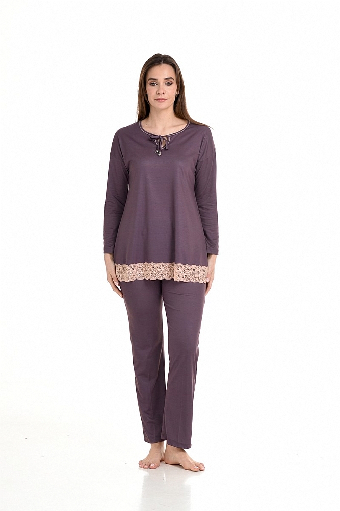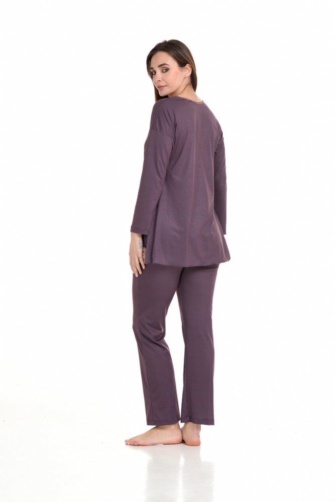 αποτελείται από μονόχρωμη μπλούζα με εντυπωσιακή λεπτομέρεια στη λαιμουδιά και όμορφους ζεστούς χρωματικούς συνδυασμούς .Το σετ συμπληρώνει ένα παντελόνι μονόχρωμο στο ίδιο παστέλ χειμερινό χρώμα δίνει μια υπέροχω αίσθηση απαλότητας.