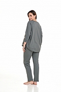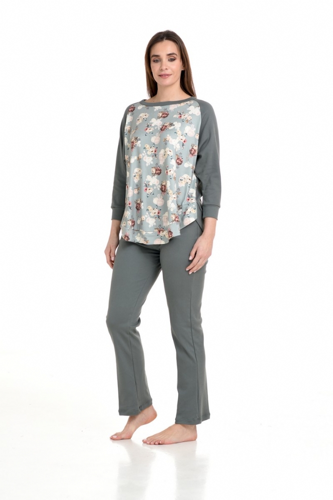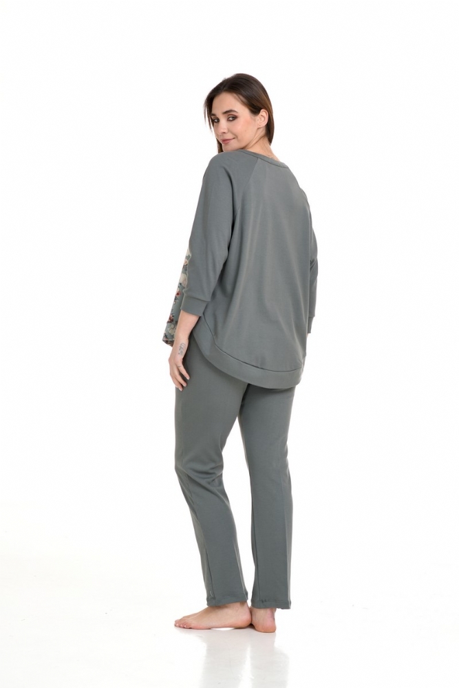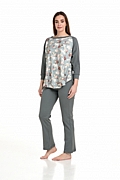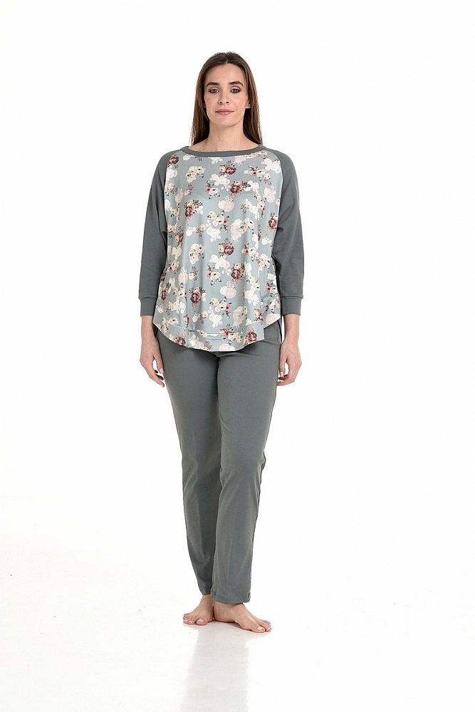 διακριτική κομψότητα. Η εμπριμέ φλοράλ κάπα διαθέτει λαιμόκοψη  και  τρουακάρ μανίκια, ενώ το παντελόνι είναι διακοσμημένο με χειμερινό γκρι χρώμα .Ένα σετ για τις στιγμές χαλάρωσης στο